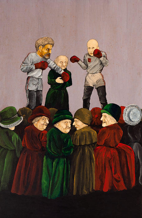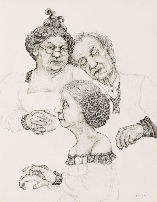 אמו, דודתו, אשתו מרתה והוא עצמו, תופסים מקום משמעותי במכלול הדמויות בציוריו. סרלוס מתאר עולם שלם של אנשים זקנים באירוניה עדינה - קהילה אשר מזדקנת בקצב בלתי פוסק.