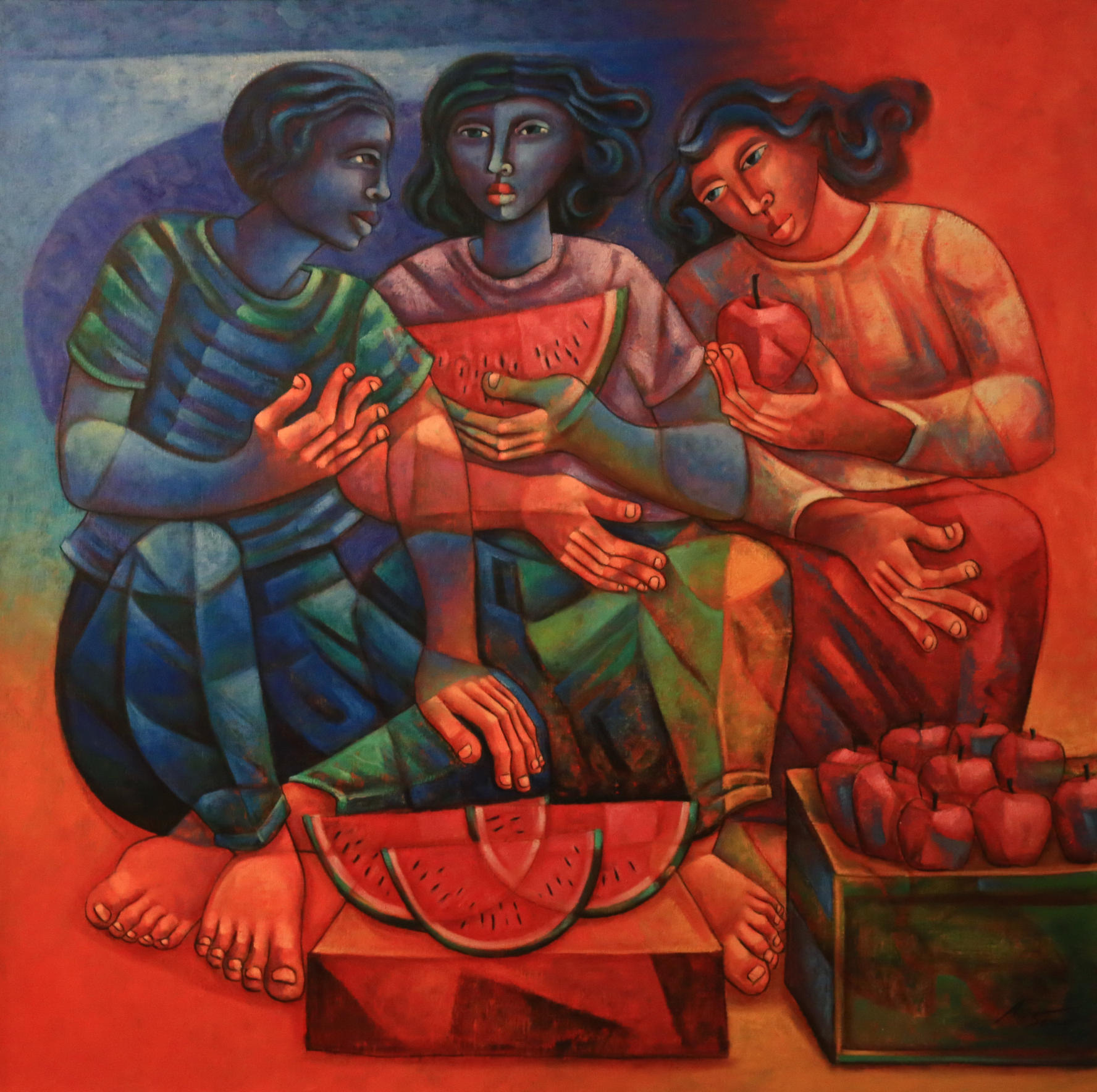 His work features striking colours --with a clear emphasis in the use of blue, pink and red--, depicting life in the countryside, farmers with big hands and feet, oftentimes with furrowed faces, barefoot characters standing next to animals and musical instruments, portraying a unique, magical world where social problems are intertwined with emotion and happiness.