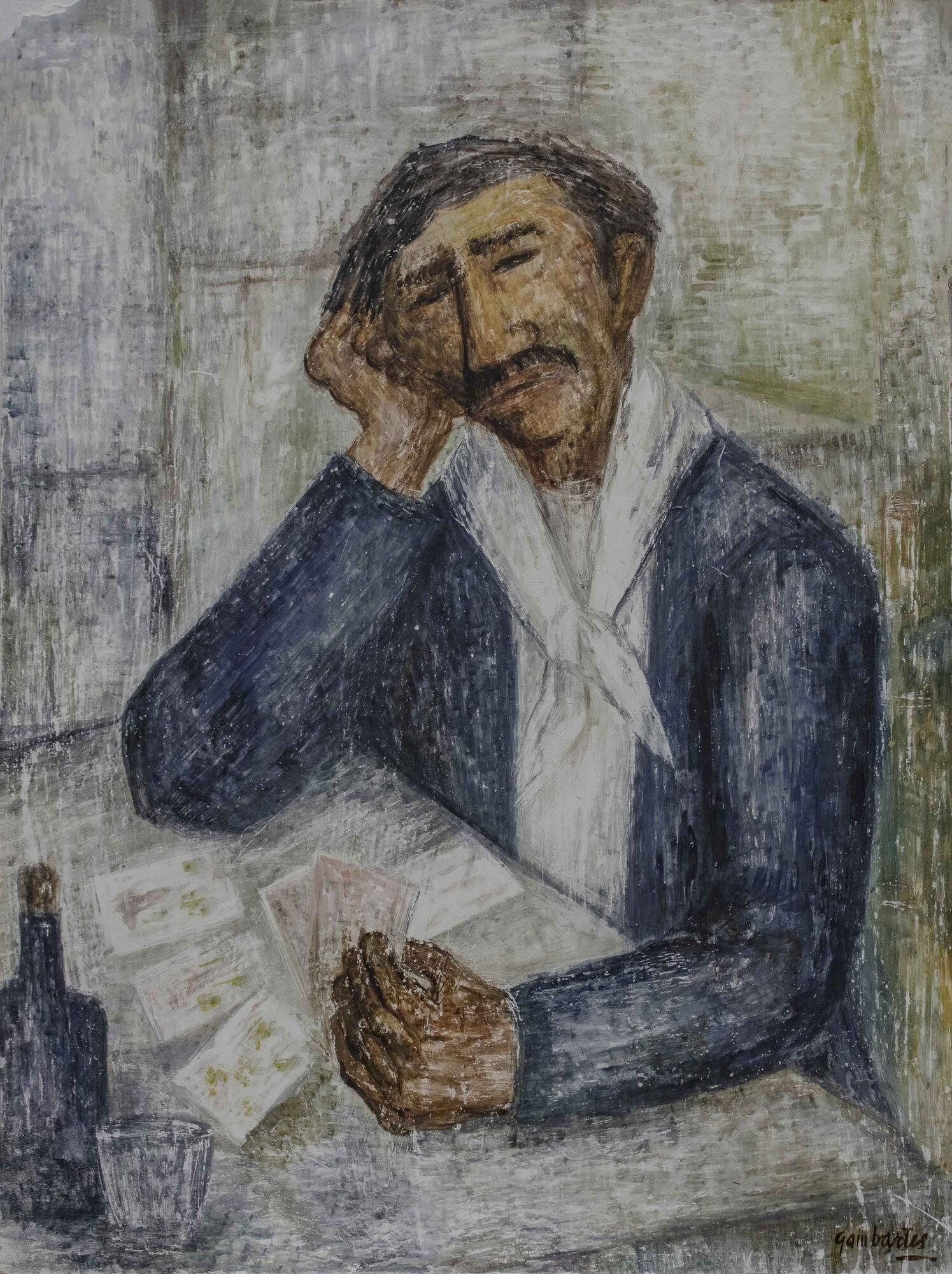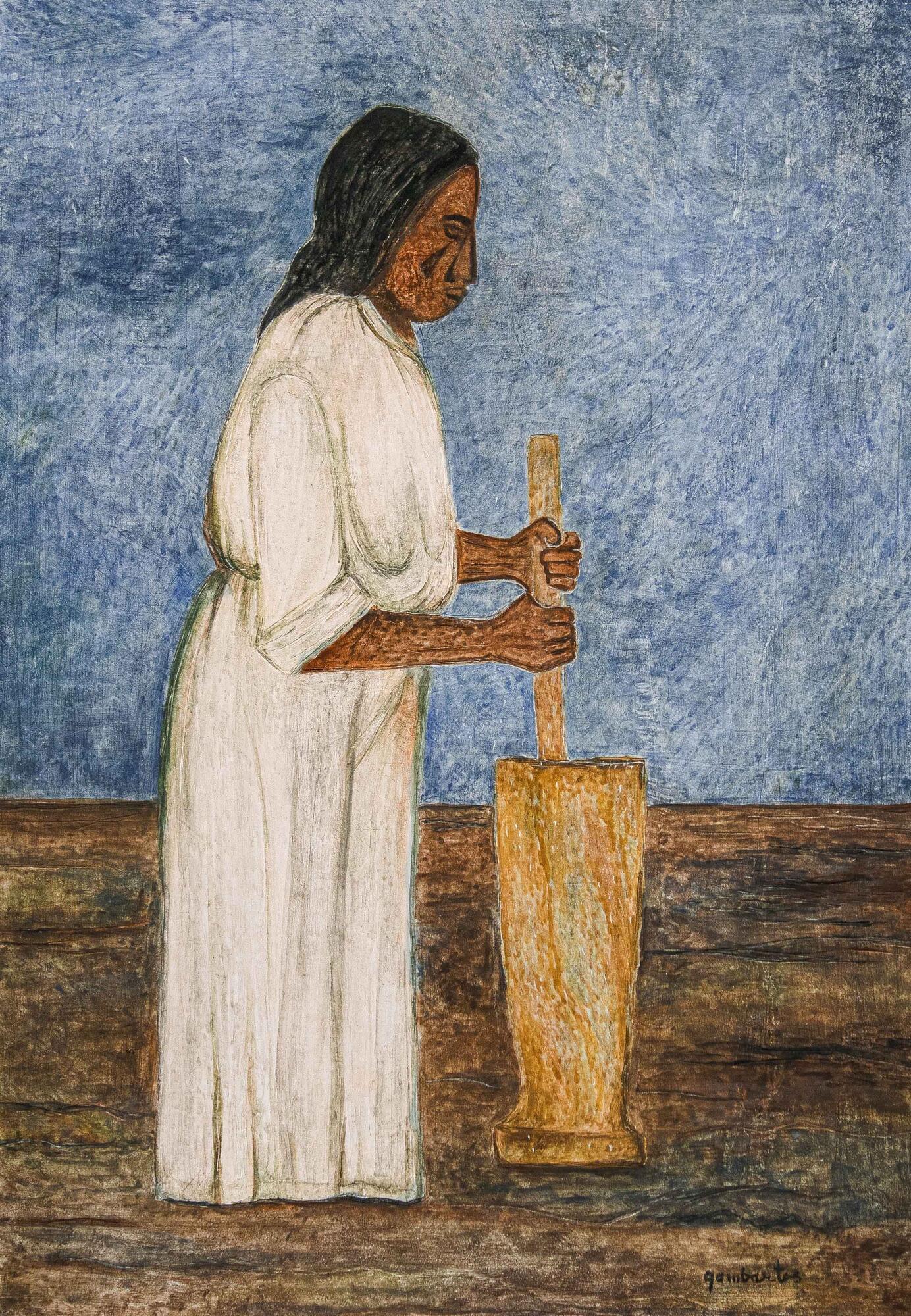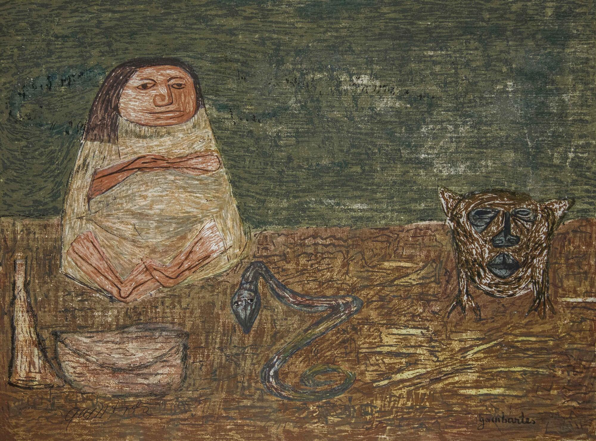 His production during this last stage can be divided by themes into two series: Mito, magia y misterio (“Myth, magic and mystery”) and Figuras y paisajes (“Figures and landscapes”), with the works exhibited here belonging to the latter series. They depict scenes from the daily lives of people living in the periphery, mainly indigenous women working the land, as well as motherhood. His figures are shown hieratically, either standing, sitting or squatting, with a use of colour that ranges between sombre and warm. Despite the mundane nature of these scenes, Gambartes always subtly included the magical world that was typical of the communities represented. From his last stage, we could highlight his experimentation with plasticity, material and language, inventing the pictorial technique cromo al yeso (“plaster chrome”). His direct influences include Antonio Berni, David Alfaro Siqueiros, Joaquín Torres García himself and Paul Klee.