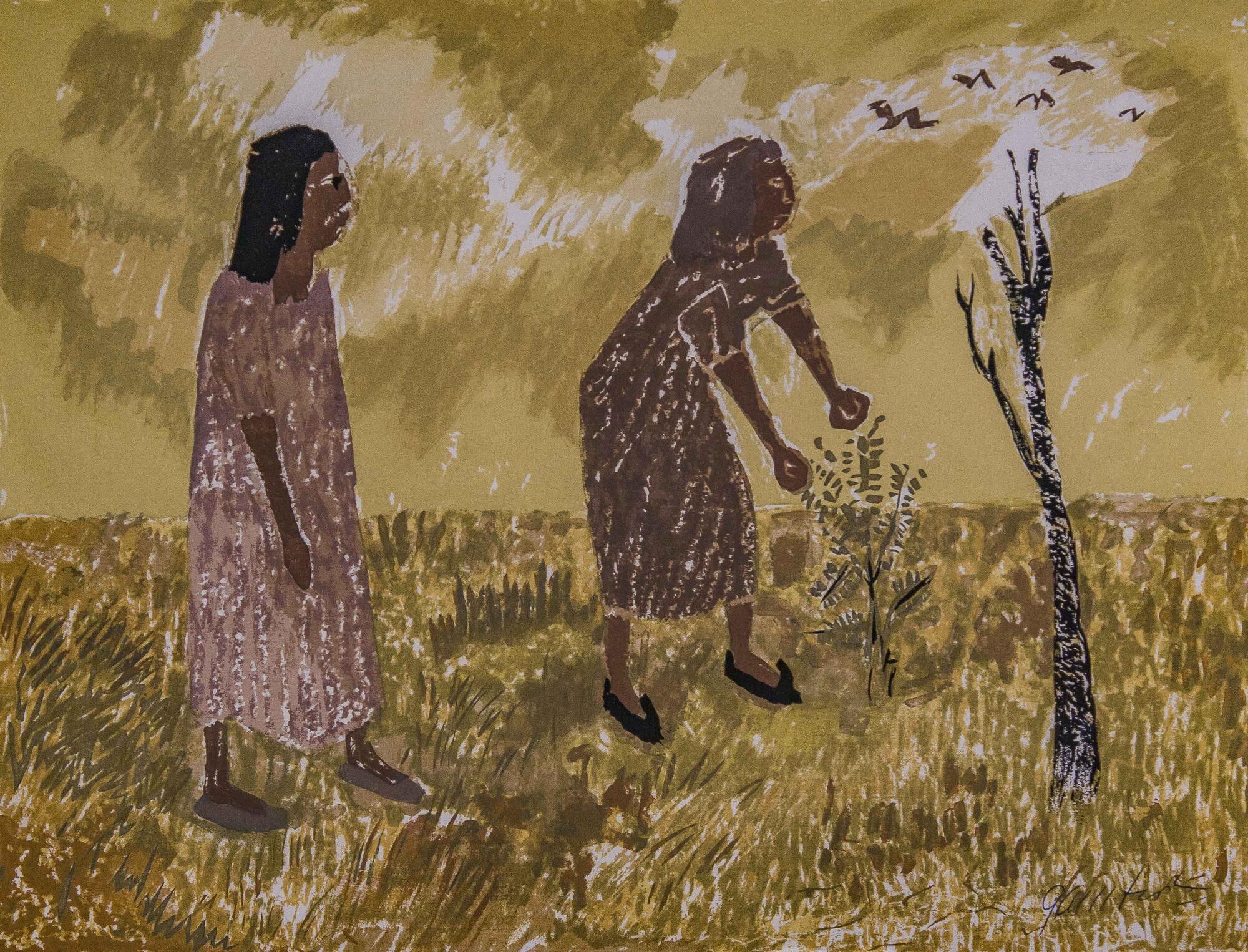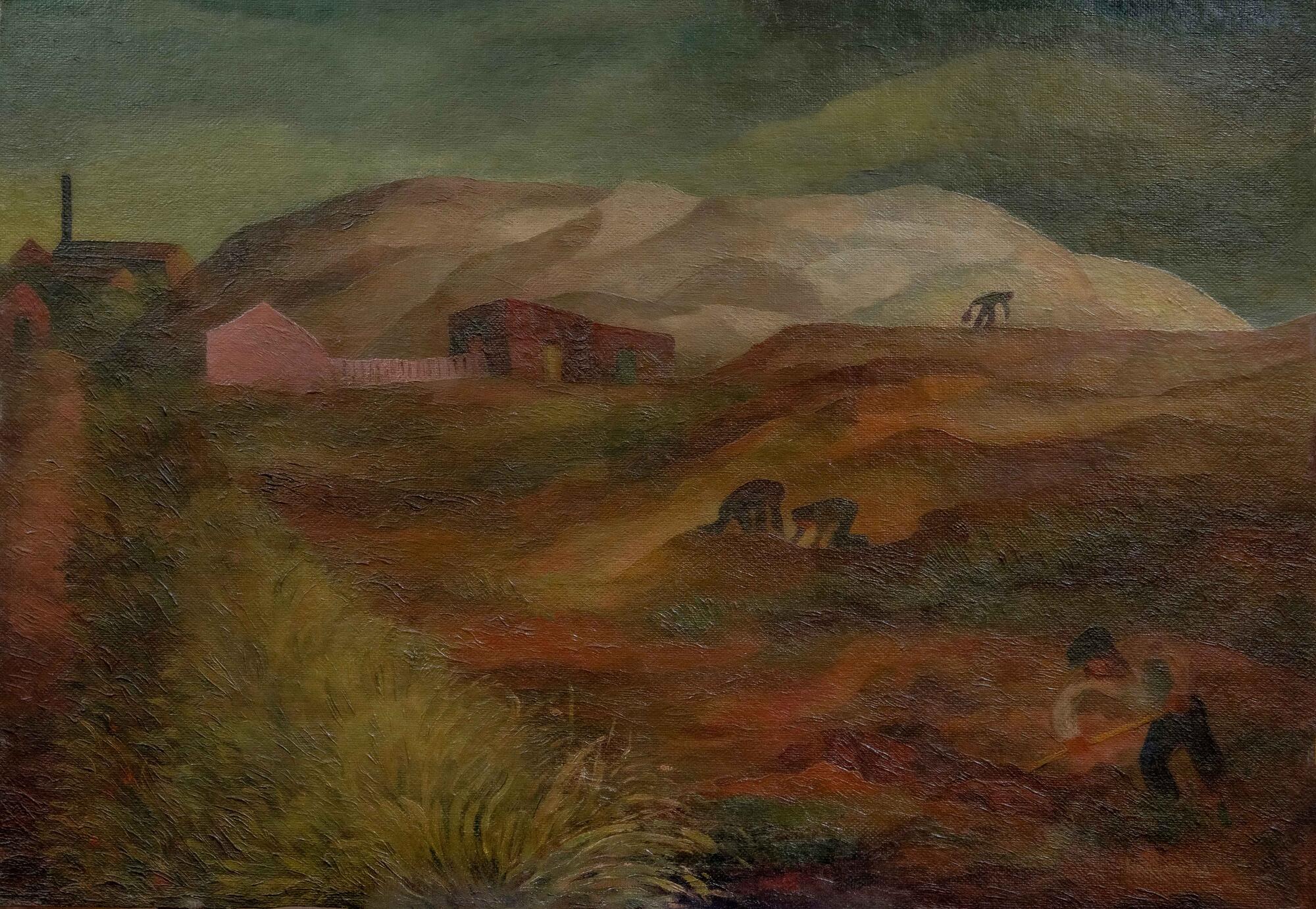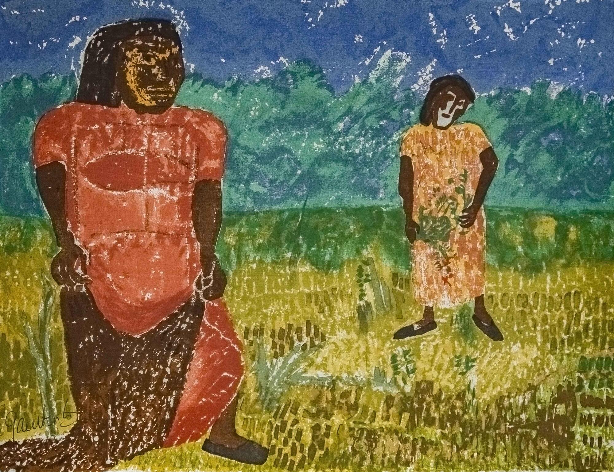 His production during this last stage can be divided by themes into two series: Mito, magia y misterio (“Myth, magic and mystery”) and Figuras y paisajes (“Figures and landscapes”), with the works exhibited here belonging to the latter series. They depict scenes from the daily lives of people living in the periphery, mainly indigenous women working the land, as well as motherhood. His figures are shown hieratically, either standing, sitting or squatting, with a use of colour that ranges between sombre and warm. Despite the mundane nature of these scenes, Gambartes always subtly included the magical world that was typical of the communities represented. From his last stage, we could highlight his experimentation with plasticity, material and language, inventing the pictorial technique cromo al yeso (“plaster chrome”). His direct influences include Antonio Berni, David Alfaro Siqueiros, Joaquín Torres García himself and Paul Klee.