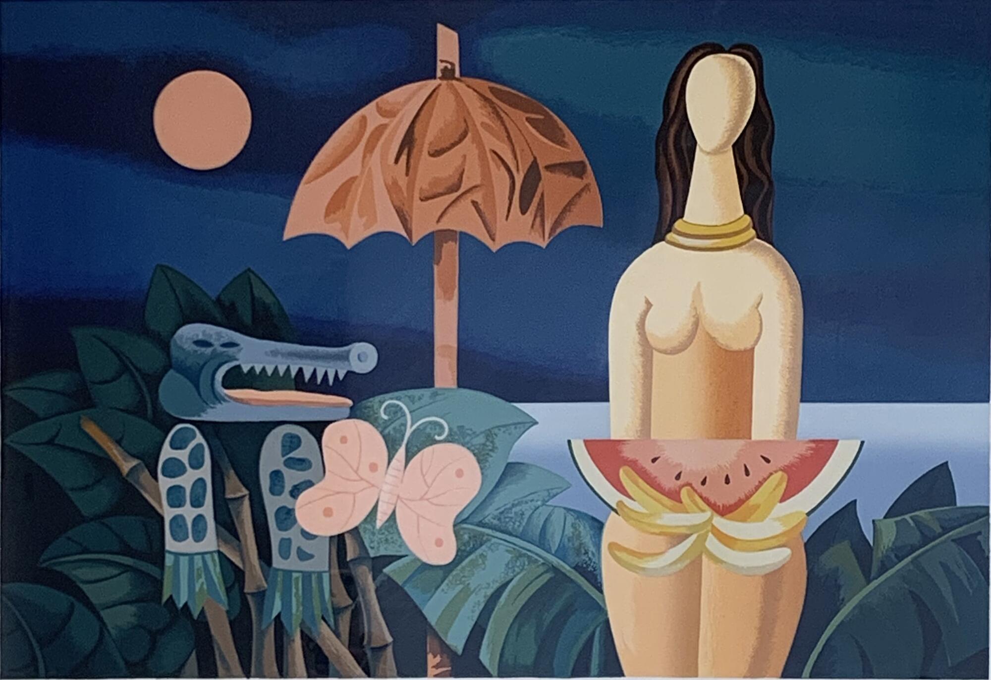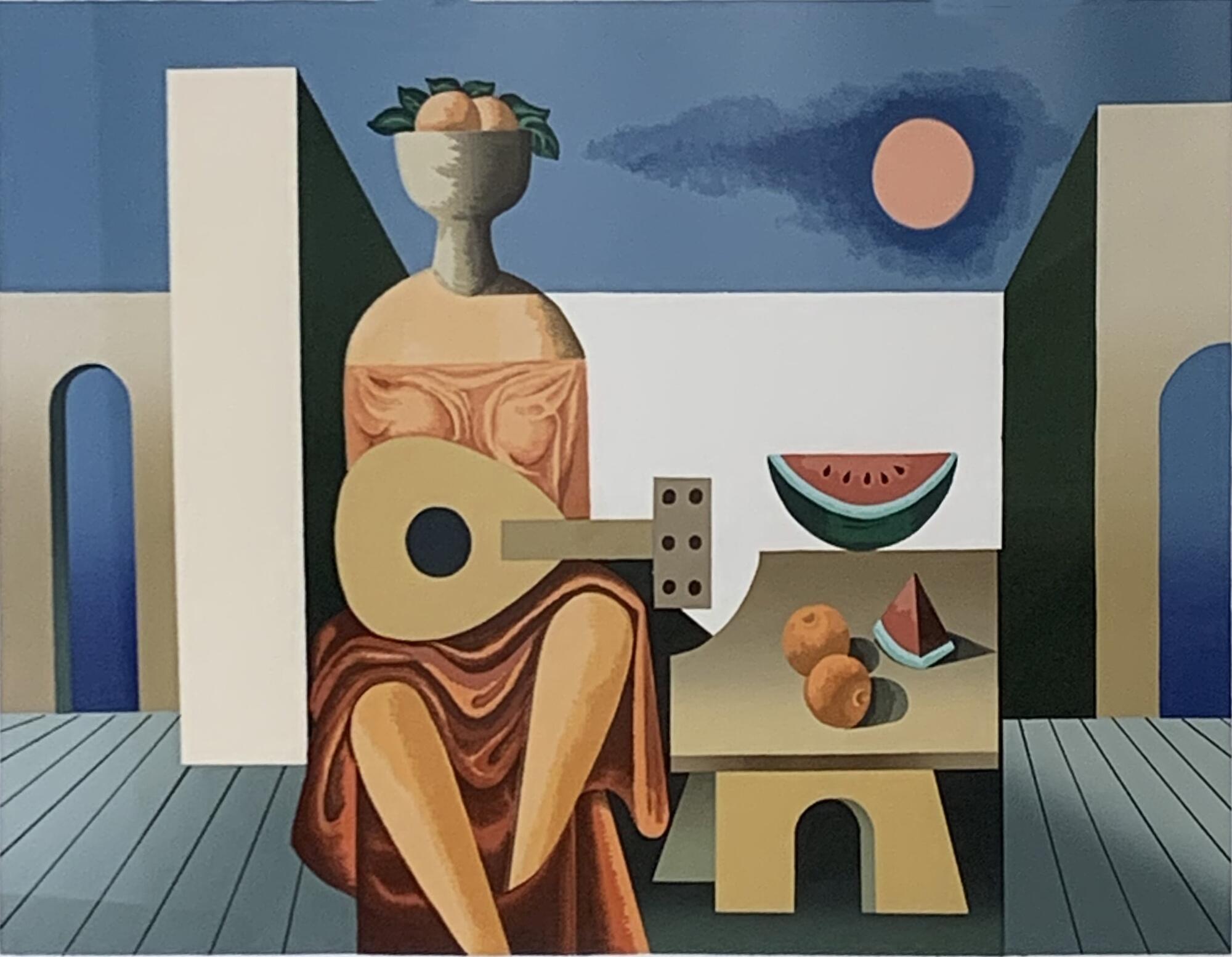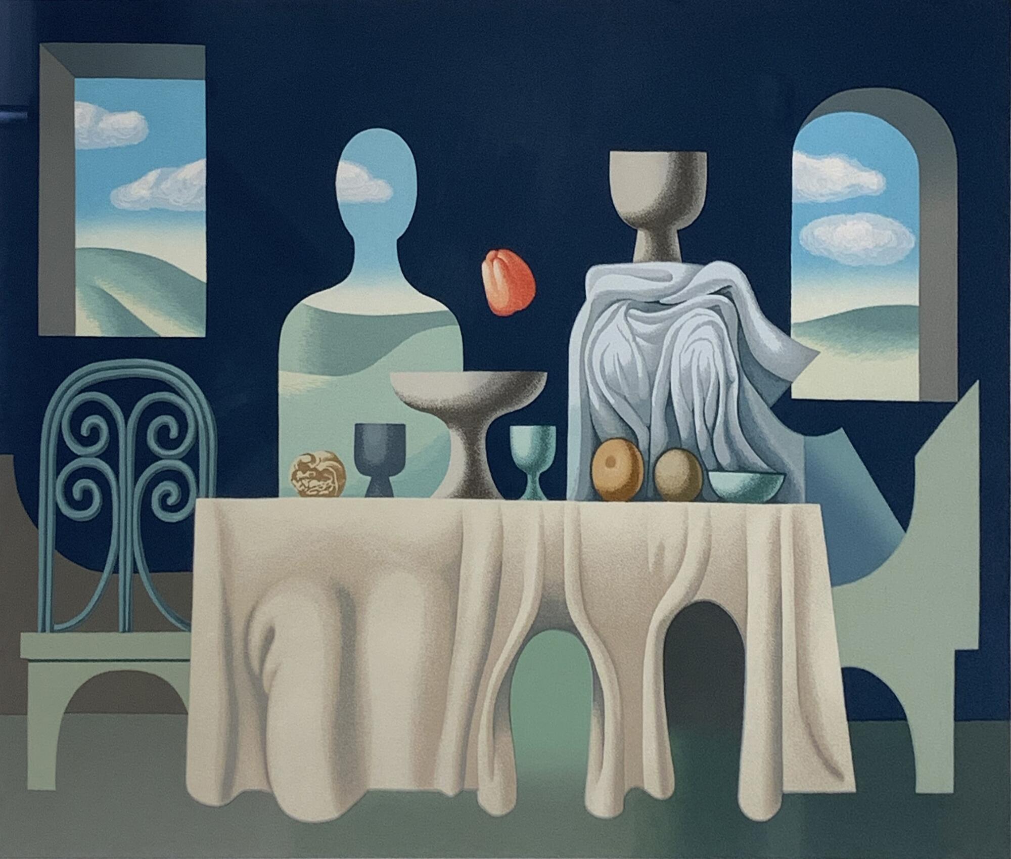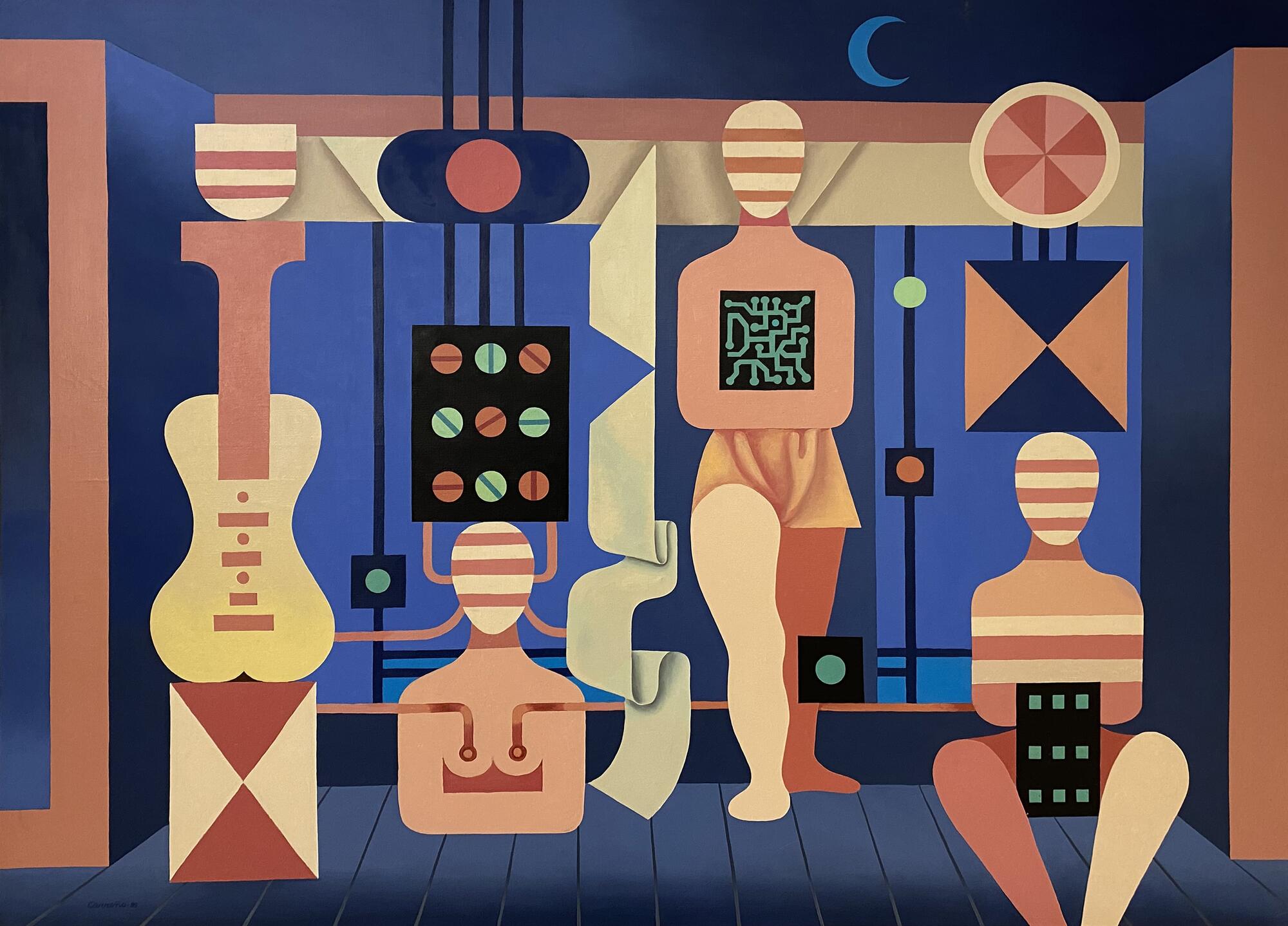 En esta oportunidad, el universo pictórico del artista nos otorga una mirada a la construcción identitaria de lo latinoamericano, integrando referencias clásicas, la abstracción geométrica de los años ´50 en Nueva York y las influencias de destacados artistas, poetas y escritores contemporáneos. La muestra está compuesta por 17 serigrafías, 1 dibujo en lápiz grafito y 3 óleos sobre tela en gran formato, con colores primarios, secundarios e incandescentes destaca la figura humana, la creación de universos opuestos pero complementarios; uno real y objetivo y otro, onírico y de ilusión donde el artista reorganiza con su imaginación el ordenamiento lógico de la realidad.